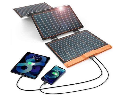 [Солнечные зарядные устройства с двойным USB]Встроенный в 1* USB-A и 1* USB-C выходной порты. Каждый USB-порт максимум 18w ((5v-3A/9V-2A/12V-1.5AMAX),